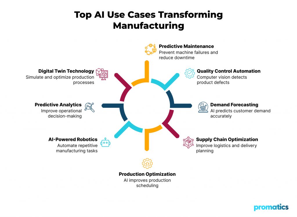 Predictive analytics helps manufacturers forecast demand, optimize inventory, and plan maintenance schedules.