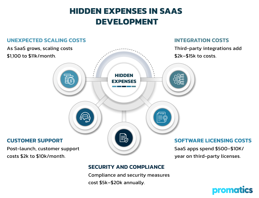 Apart from the standard development and maintenance costs, there are several hidden expenses that can significantly increase the overall cost of SaaS development.