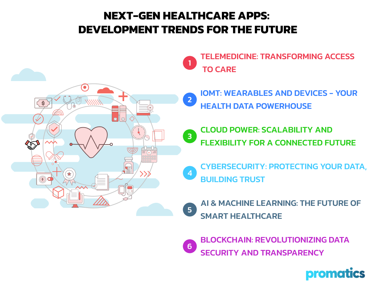 Healthcare is undergoing a digital metamorphosis driven by cutting-edge technology and the ever-increasing demand for accessible, effective care. Here at Promatics India, we stay ahead of the curve by incorporating these six critical trends into our healthcare app development process:
