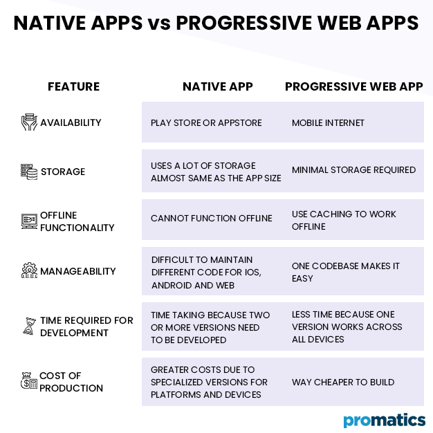 Both native and progressive web apps have their own benefits but in order to briefly summarize the difference between the two, their basic features have been compared.