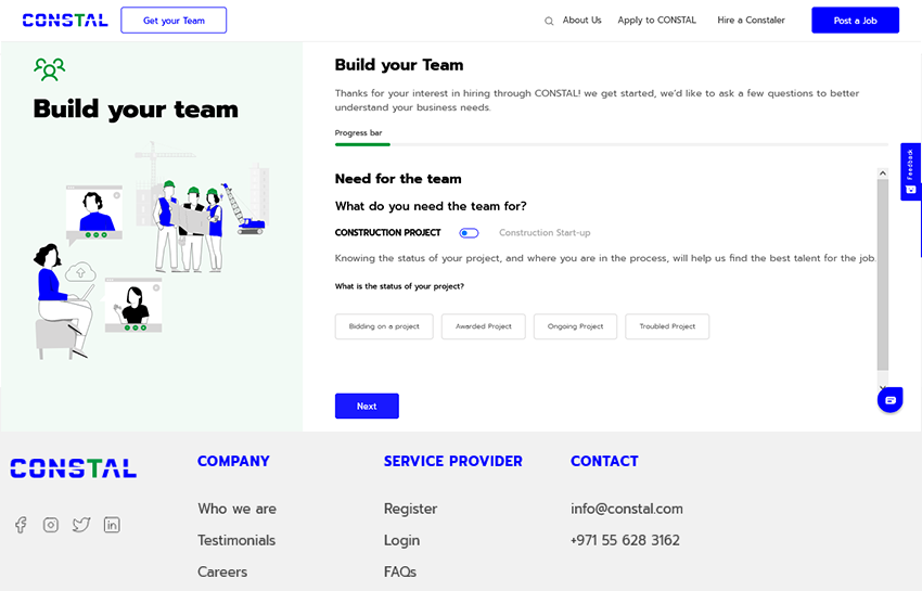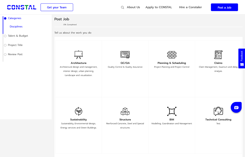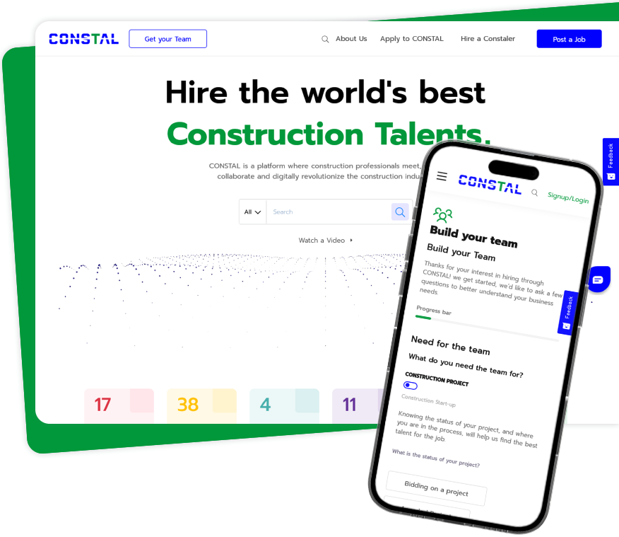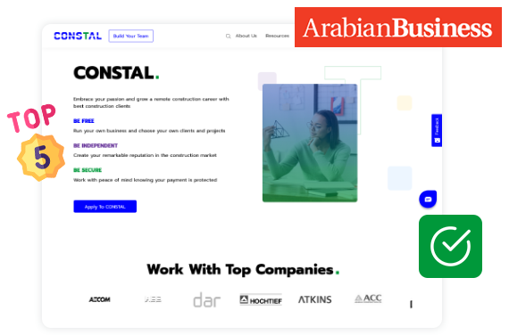 Constal is an online freelancing platform that connects businesses and organizations with skilled Talents from around the world. The platform was founded in 2020 by Abdullah Bash & Alamira and has since transformed the way people work and hire worldwide. Constal is committed to providing top construction industry talents with construction companies across the globe. The platform is curated by industry experts who aim to disrupt the traditional way of working and become more agile, efficient, and digital. By using Constal, businesses and organizations can save time and money while being confident that their projects will be a success.