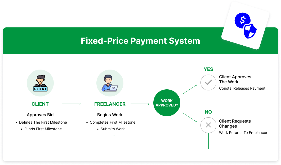 Constal’s Payment Protection mechanism serves as a robust safeguard, guaranteeing prompt remuneration to freelancers for their diligent efforts while simultaneously ensuring clients receive the desired deliverables for which they have made payment. The system is fortified by a robust dispute resolution process, designed to swiftly resolve any contingencies that may arise during the course of the project.